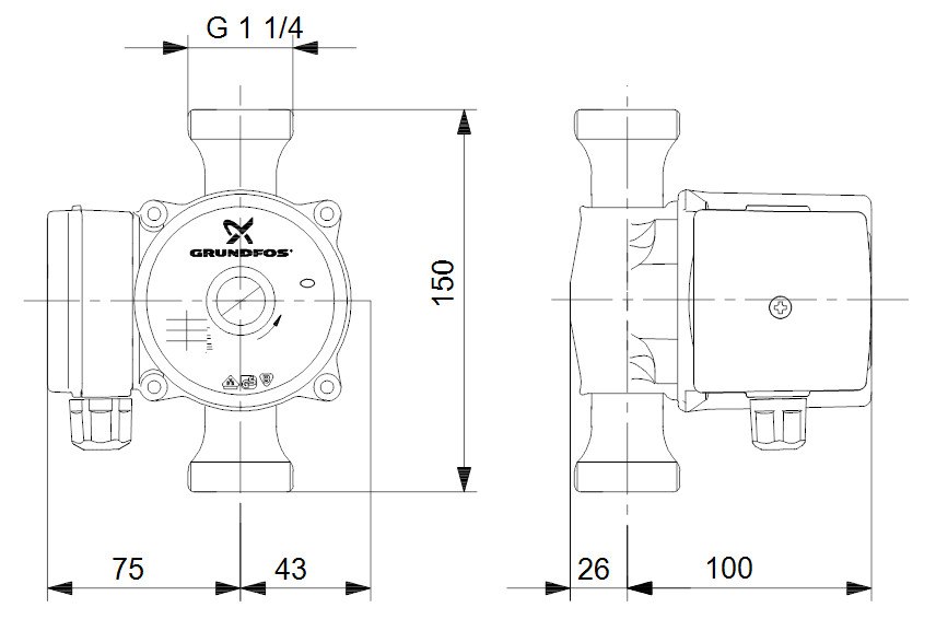 • Grundfos UP 20-30N 150 Bezdławicowa pompa obiegowa c.w.u, 1x230V, 10bar, PN10 kod 59643500