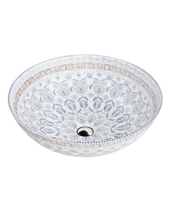 Umywalka nablatowa FOLKLOR wyróżnia się okrągłą bryłą i cienkim rantem. Model posiada nietuzinkowy, wielobarwny wzór w stylu folkowym. Jeśli poszukujesz wykwintnego i modnego dodatku do swojej wymarzonej łazienki, ten model pozwoli Ci stworzyć nietuzinkową aranżację wnętrza. Kompaktowy rozmiar umywalki nablatowej FOLKLOR sprawia, że możesz zamontować ją w różnej wielkości łazience. Umywalka nie posiada przelewu ani otworu na baterię.