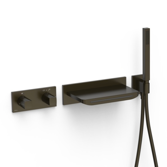 · W zestawie korpus podtynkowy termostatyczny instalowany poziomo.· Regulator natężenia przepływu i przełącznik funkcji 2-drożny.· Pokrętło kwadratowo-okrągłe.· Wylewka stała naścienna Strumień kaskadowy.· Uchwyt do słuchawki prysznicowej z przyłączem w ścianie.· Słuchawka prysznicowa z mosiądzu systemem zapobiegającym osadzaniu się kamienia.· Satynowy wąż.