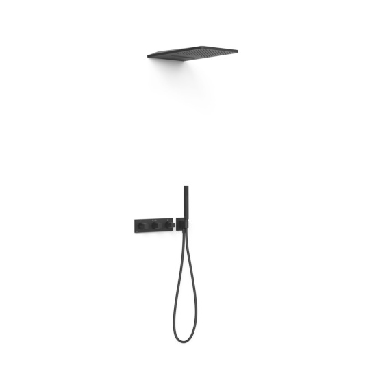 · W zestawie korpus podtynkowy termostatyczny instalowany poziomo.· Regulator natężenia przepływu i przełącznik funkcji 3-drożny.· Pokrętło kwadratowo-okrągłe.· Deszczownia naścienna ze stali nierdzewnej z 2 funkcje (deszcz/kaskada). 280x550 mm. WAŻNE: Zamontować odpływ >50 l/min.· Uchwyt do słuchawki prysznicowej z przyłączem w ścianie.· Słuchawka prysznicowa z mosiądzu systemem zapobiegającym osadzaniu się kamienia.· Satynowy wąż.