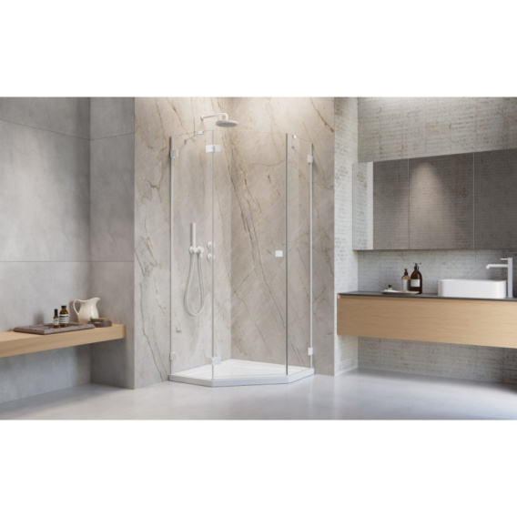 Zdjęcie przedstawia kompletne rozwiązanie składające się z drzwi oraz ścianek bocznych. Cena dotyczy samych drzwi prysznicowych.
